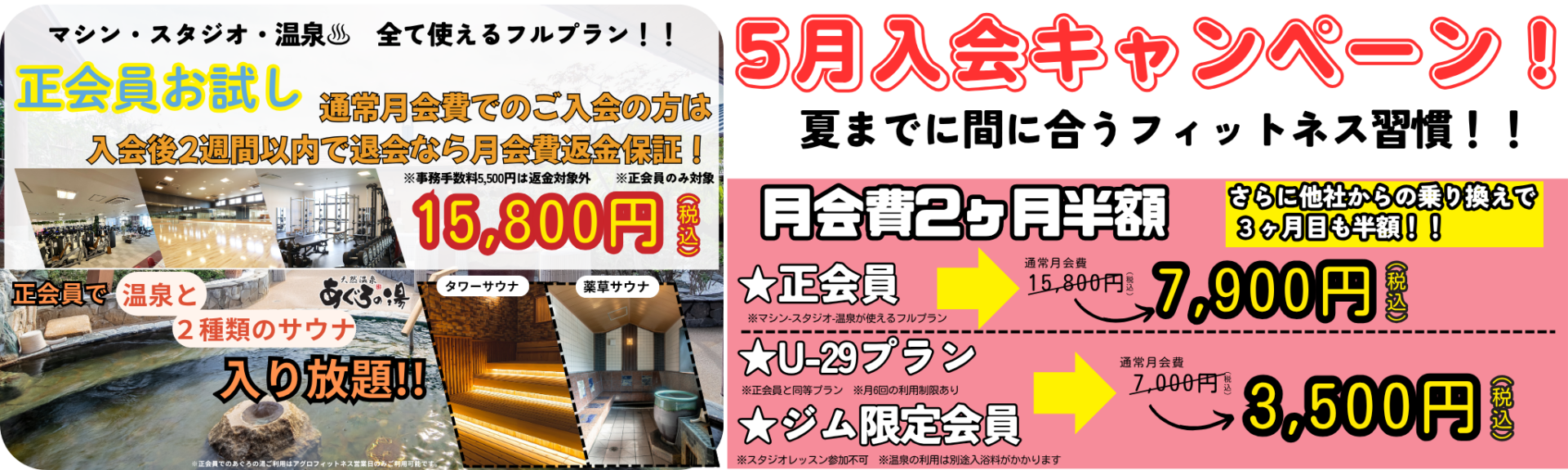 入浴が無料アグロフィットネスが他のスポーツジムと大きく違うのが、会員になると『天然温泉あぐろの湯』に無料で入浴できることです。趣が異なる数種類の浴槽に加え、露天風呂も満喫できる天然温泉で、運動後のケアもバッチリできます。(温泉だけ入りにきてくださっている会員様がいるのは内緒の話です。)