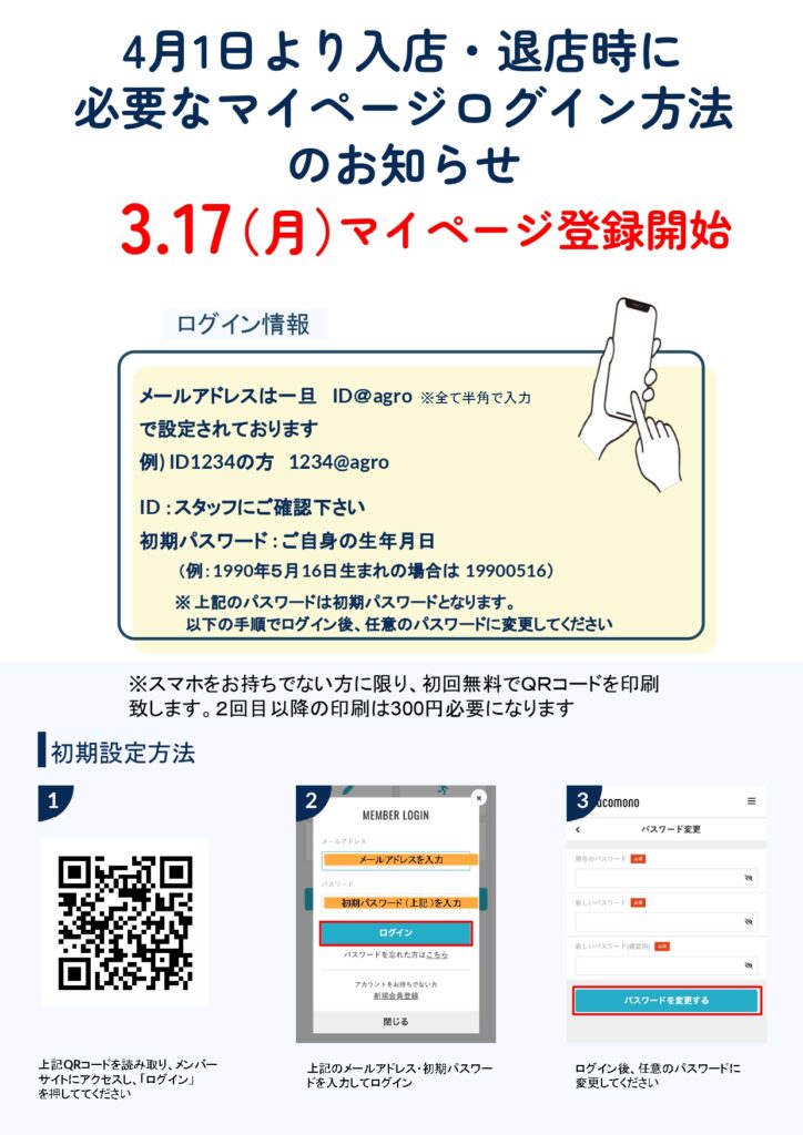 新システム マイページ開設のご案内 2025.03.19 2025年4月1日~現行の会員管理システムから新システムに変わります それに伴いご自身のスマートフォンから会員証や予約管理ができる マイページの設定をお願いいたします。 ご不明な点がございましたら店頭にてスタッフにお問い合わせください。 お知らせ一覧へ